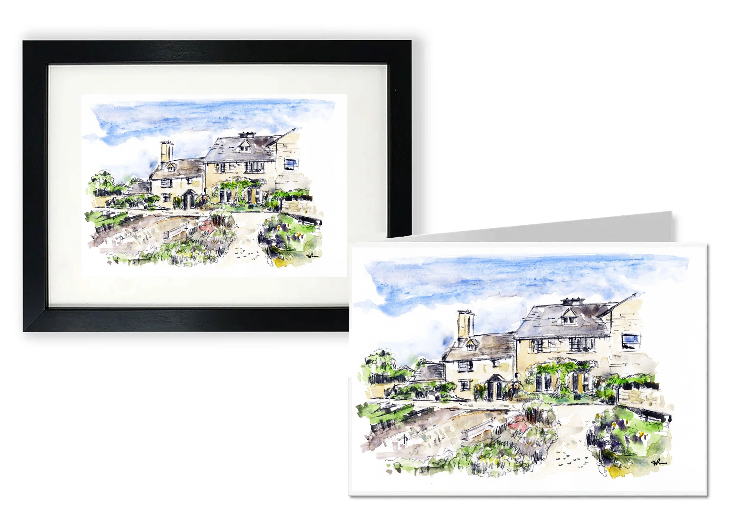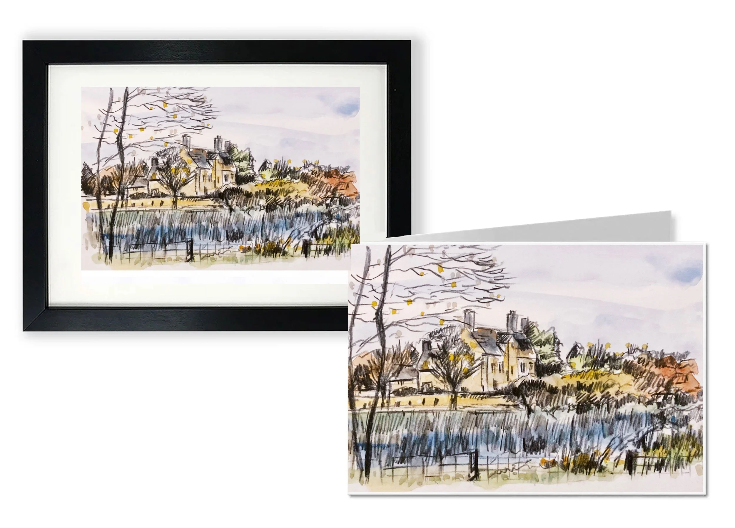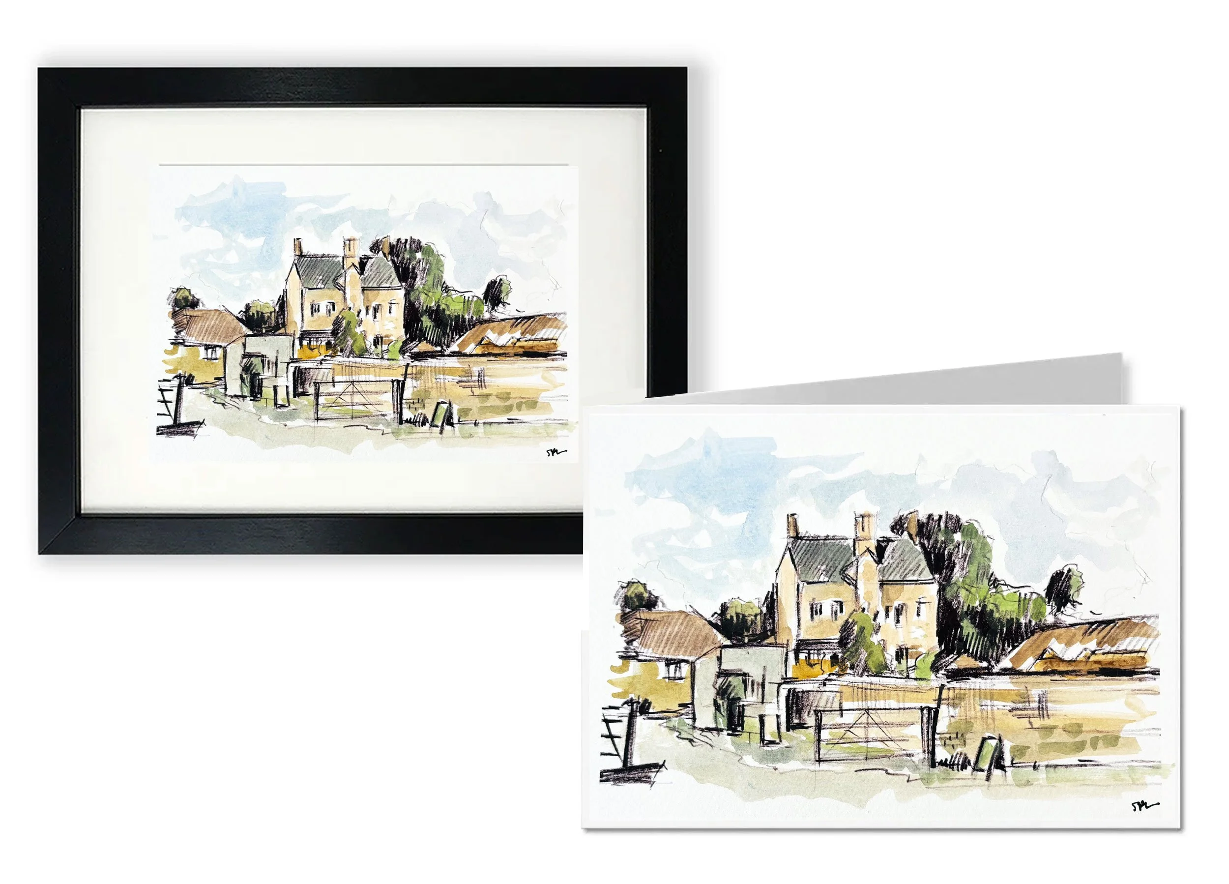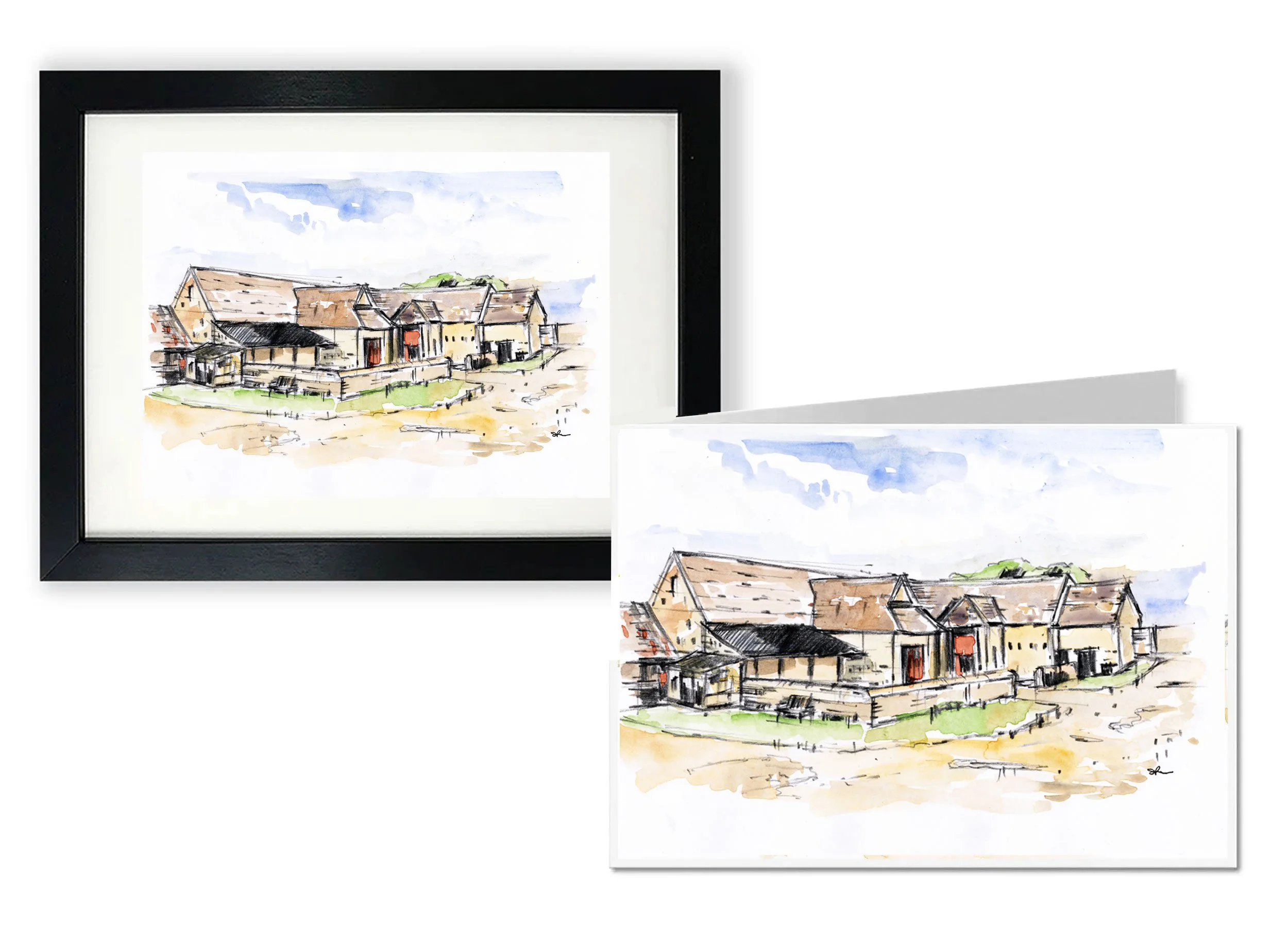 The line drawings focus on the distinctive architecture of the barns and cottages, using simple marks to capture their form, while the acrylic paintings bring greater depth of colour and a more painterly interpretation.