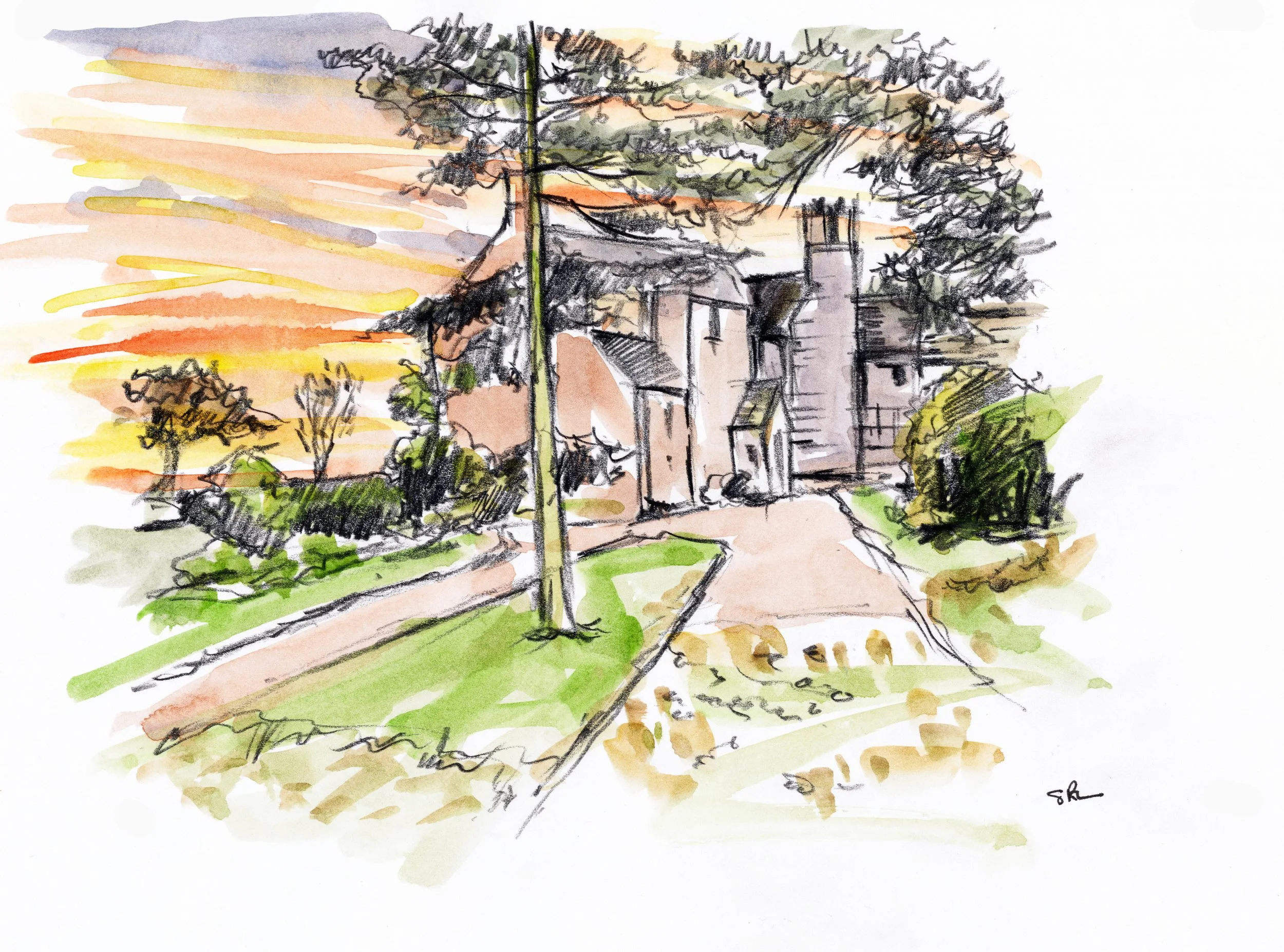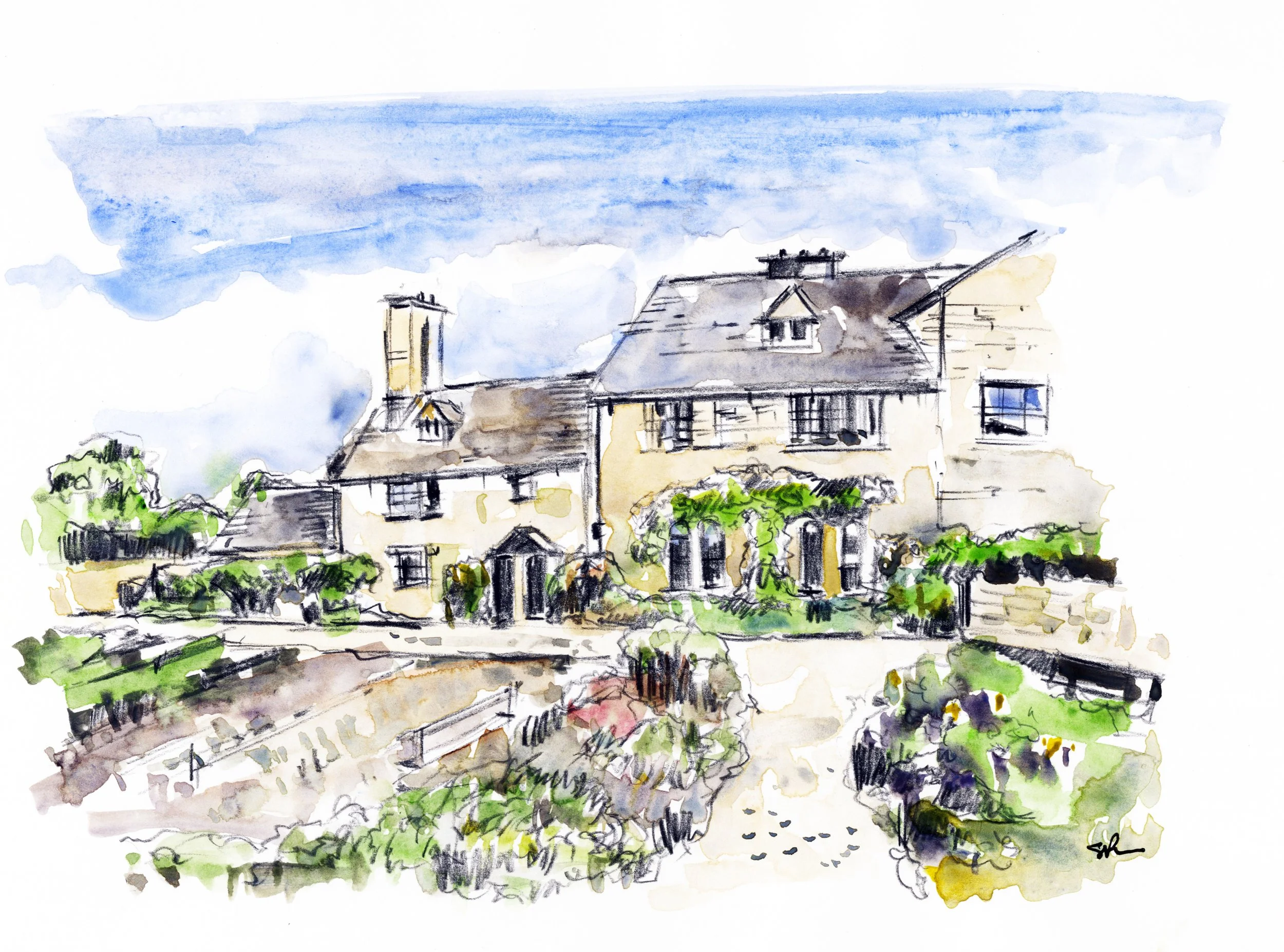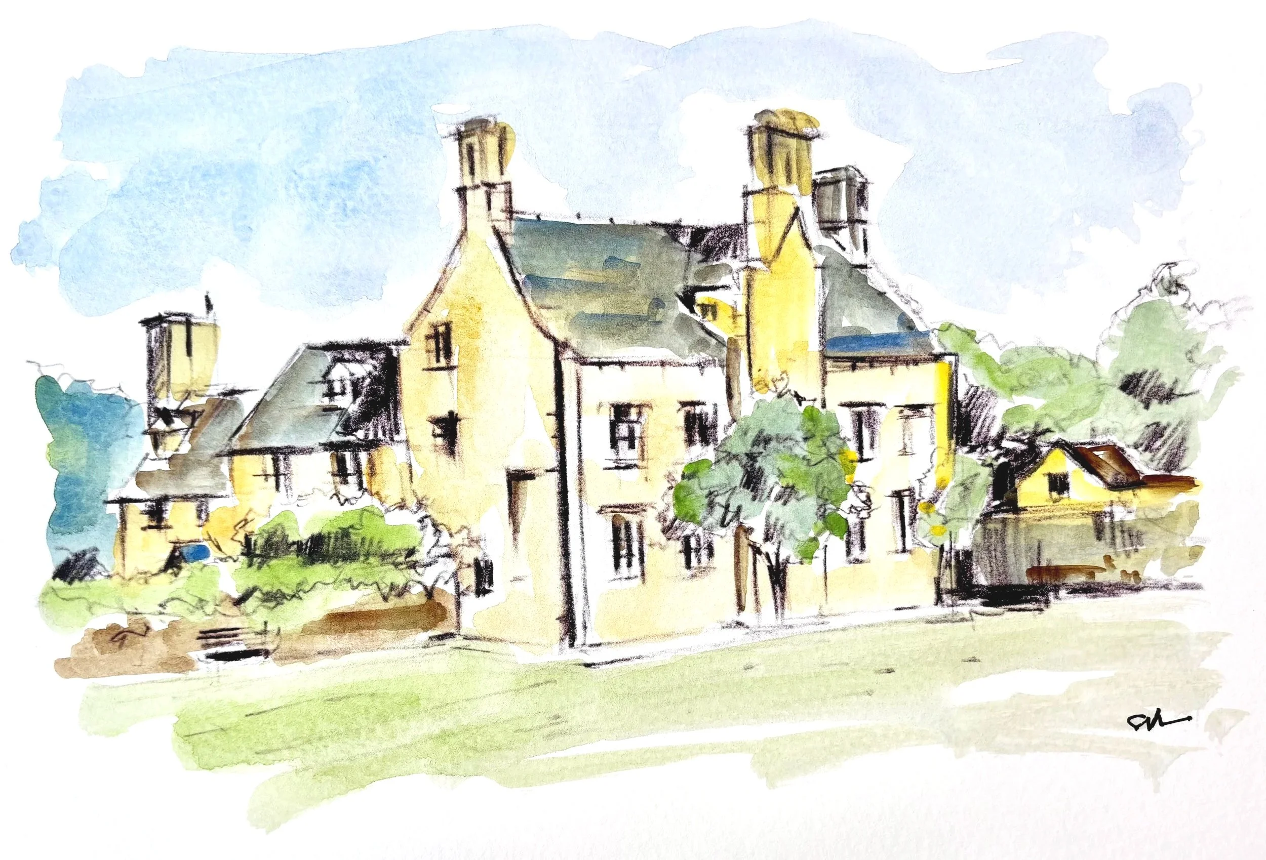 View of the manor at sunset, as a hand painted print.