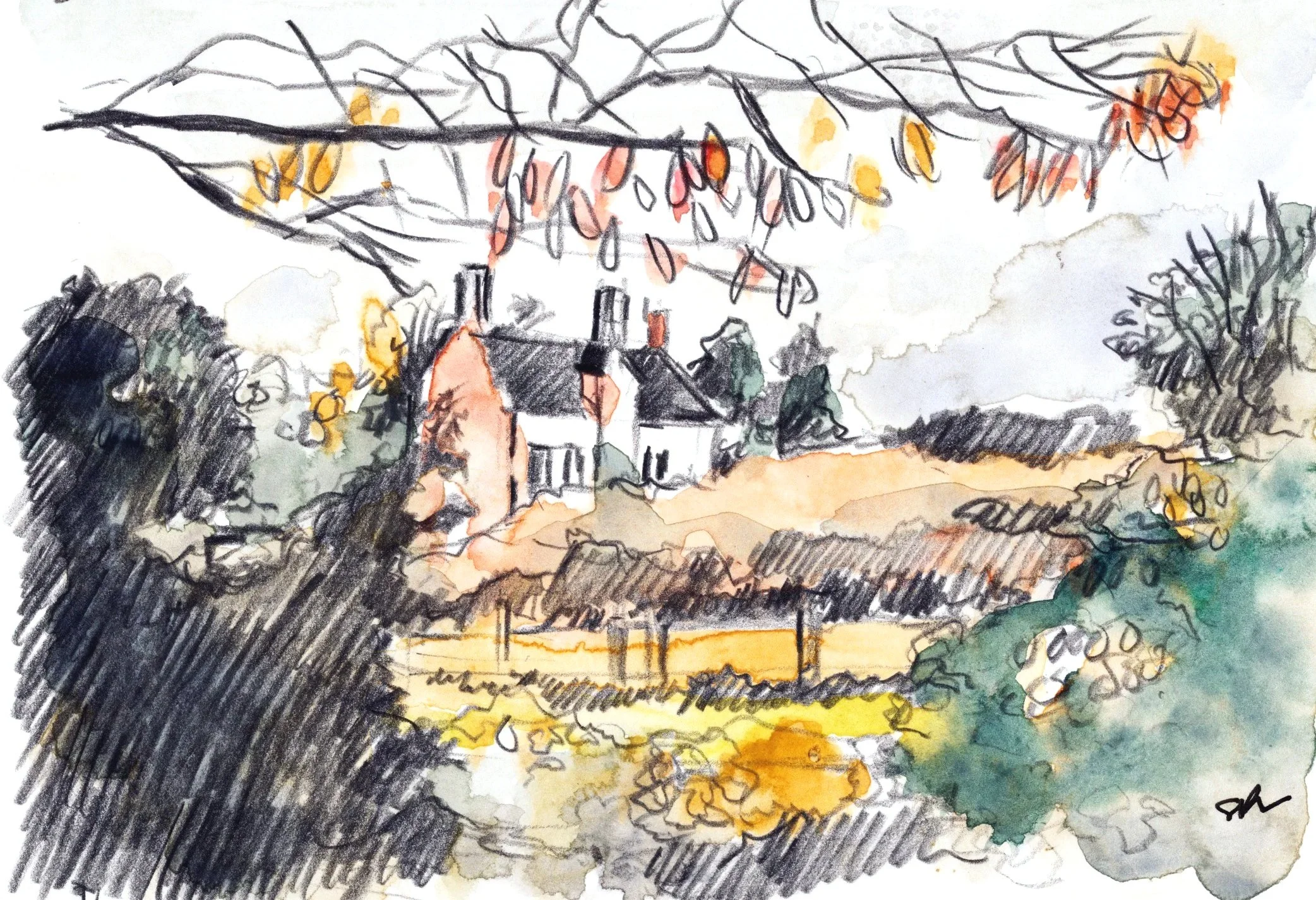 View of the manor from the fields, as a hand painted print.