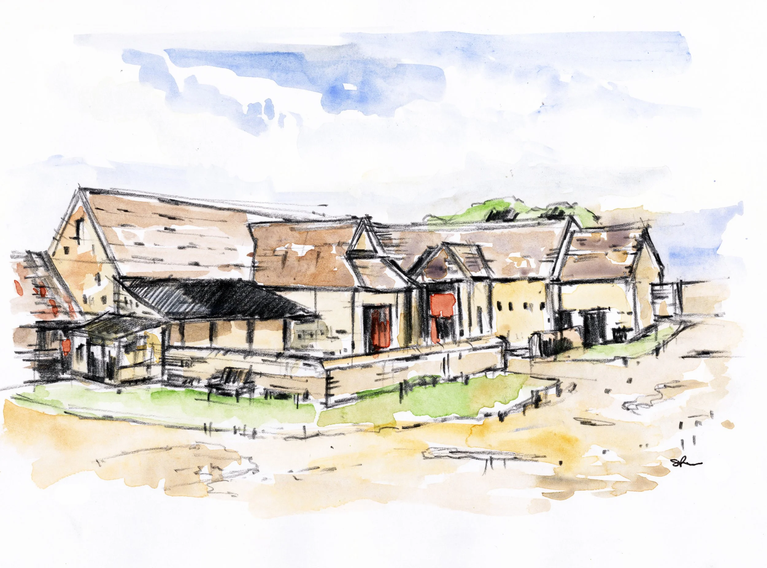 View of the barns at the manor as a hand painted print.